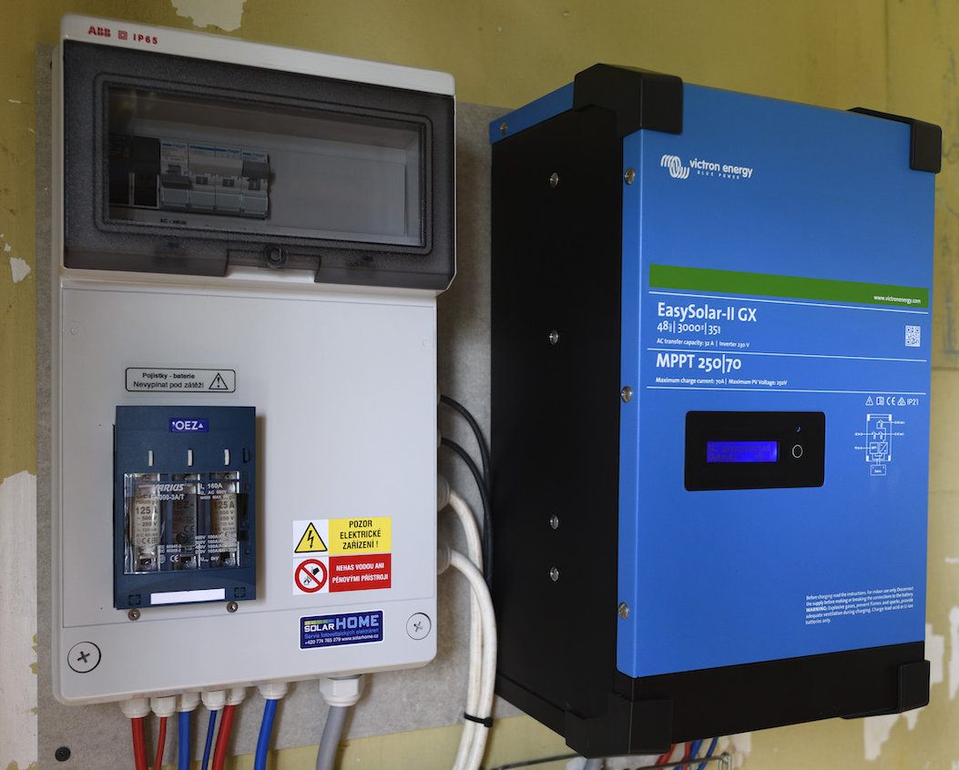 Tak máme od včerejška na Snailu elektřinu… Postarala se o to firma SOLARHOME s.r.o. a proud dodávají tři solární panely, umístěné na střeše klubovny. Součástí instalace jsou akumulátory, dobíjené právě z těchto panelů a měnič, který vyrábí elektrický proud o standardním napětí 230 V.